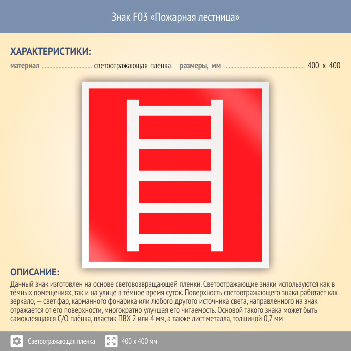 Знак F03 «Пожарная лестница» (светоотражающая пленка, 400х400 мм) в Нижнекамске купить