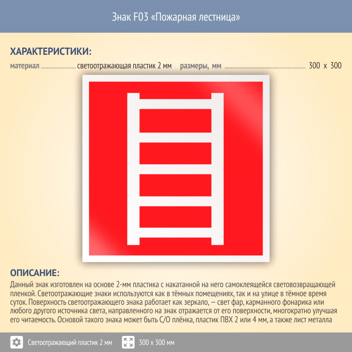 Знак F03 «Пожарная лестница» (светоотражающий пластик, 300х300 мм) в Нижнекамске купить