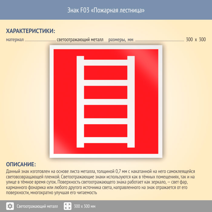 Знак F03 «Пожарная лестница» (светоотражающий металл, 300х300 мм) в Нижнекамске купить