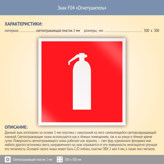 Знак F04 «Огнетушитель» (светоотражающий пластик, 300х300 мм) в Нижнекамске купить
