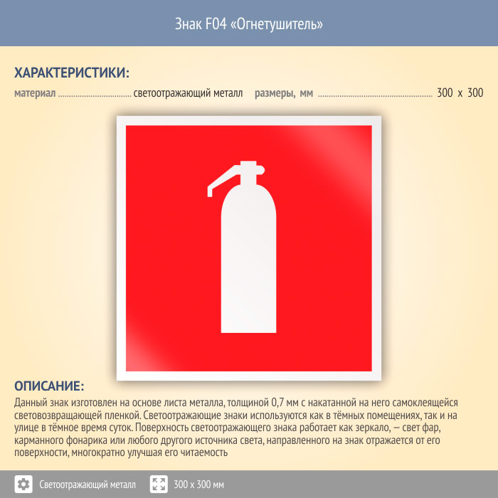 Знак F04 «Огнетушитель» (светоотражающий металл, 300х300 мм) в Нижнекамске купить