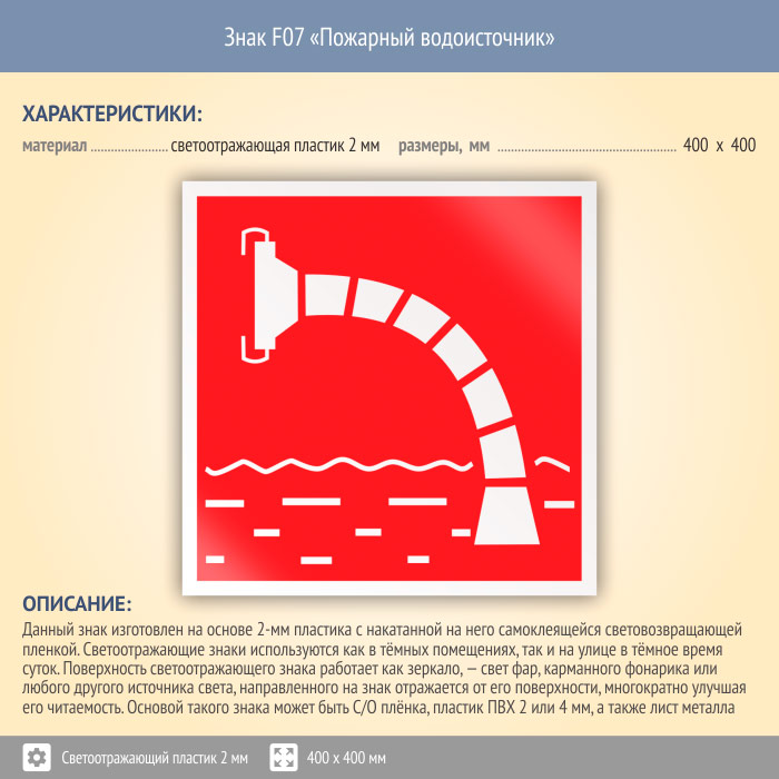 Знак F07 «Пожарный водоисточник» (светоотражающий пластик, 400х400 мм) в Нижнекамске купить