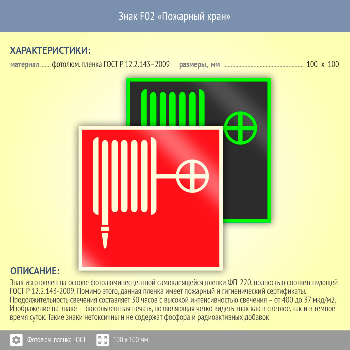 Знак F02 «Пожарный кран» (фотолюминесцентная пленка ГОСТ 34428-2018, 100х100 мм) в Нижнекамске купить