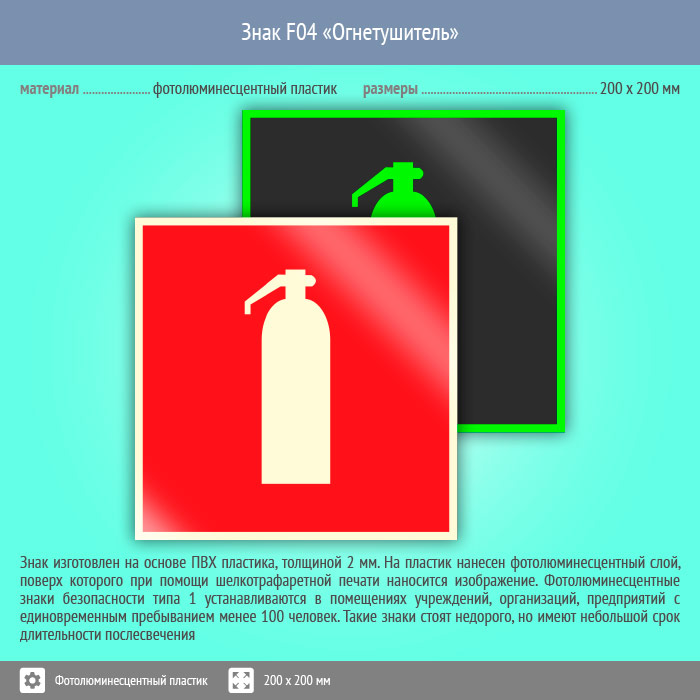 Знак F04 «Огнетушитель» (фотолюминесцентный пластик, 200х200 мм) в Нижнекамске купить