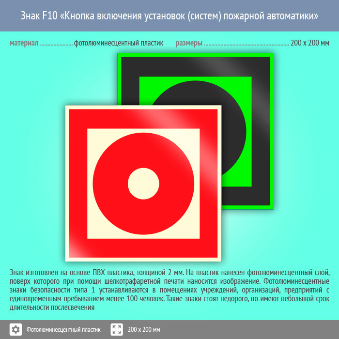 Знак F10 «Кнопка включения установок (систем) пожарной автоматики» (фотолюминесцентный пластик, 200х200 мм) в Нижнекамске купить