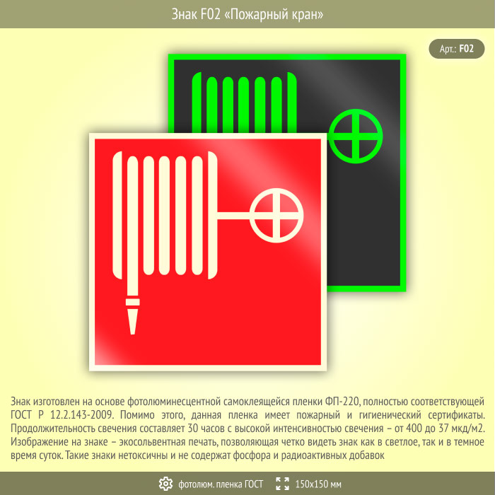 Знак F02 «Пожарный кран» (фотолюминесцентная пленка ГОСТ 34428-2018, 150х150 мм) в Нижнекамске купить