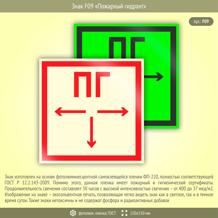 Знак F09 «Пожарный гидрант» (фотолюминесцентная пленка ГОСТ 34428-2018, 150х150 мм) в Нижнекамске купить
