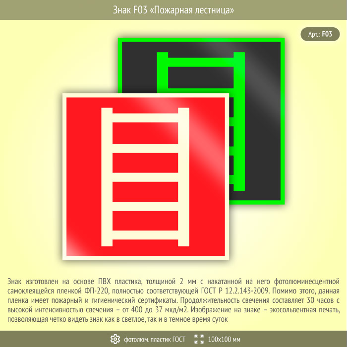Знак F03 «Пожарная лестница» (фотолюминесцентный пластик ГОСТ 34428-2018, 100х100 мм) в Нижнекамске купить