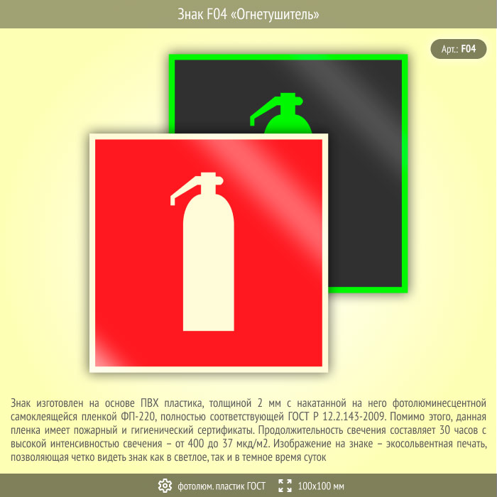 Знак F04 «Огнетушитель» (фотолюминесцентный пластик ГОСТ 34428-2018, 100х100 мм) в Нижнекамске купить