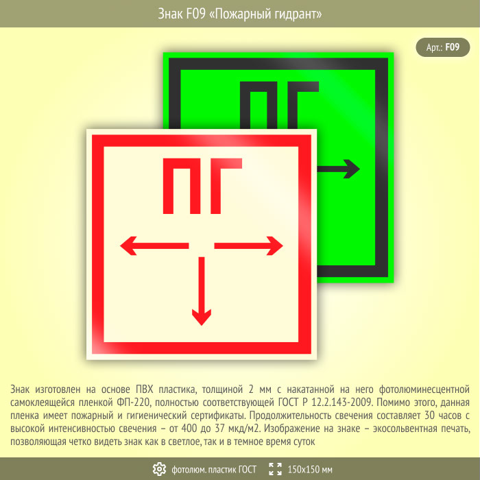 Знак F09 «Пожарный гидрант» (фотолюминесцентный пластик ГОСТ 34428-2018, 150х150 мм) в Нижнекамске купить