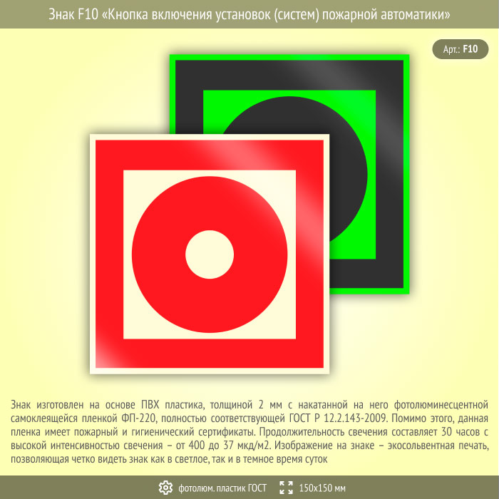 Знак F10 «Кнопка включения установок (систем) пожарной автоматики» (фотолюминесцентный пластик ГОСТ 34428-2018, 150х150 мм) в Нижнекамске купить