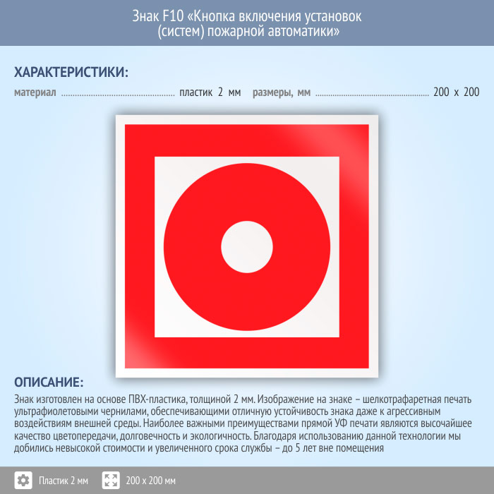 Знак F10 «Кнопка включения установок (систем) пожарной автоматики» (пластик, 200х200 мм) в Нижнекамске купить