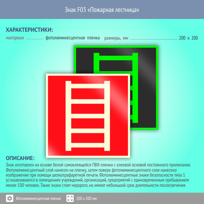 Знак F03 «Пожарная лестница» (фотолюминесцентная пленка, 200х200 мм) в Нижнекамске купить