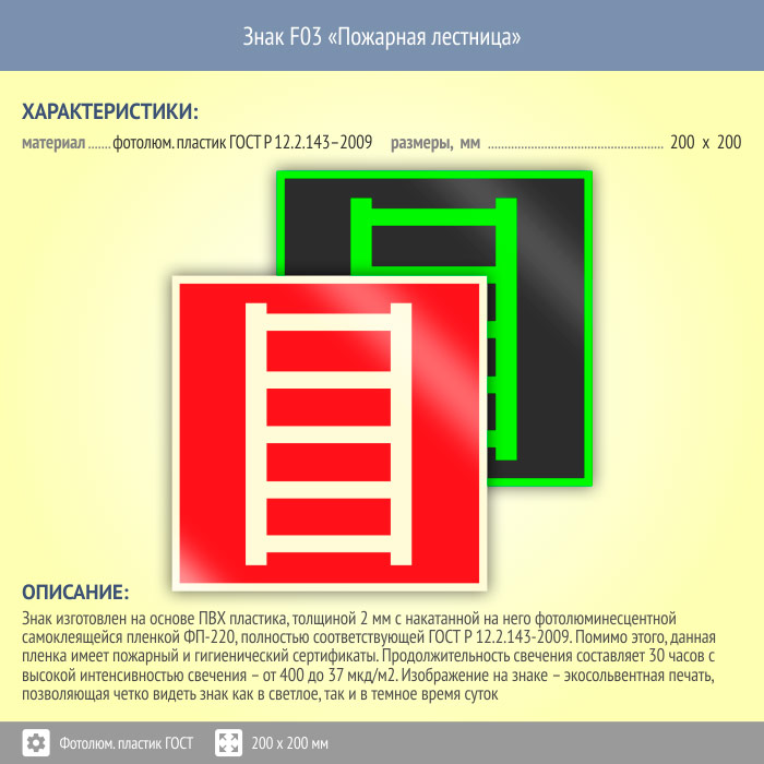 Знак F03 «Пожарная лестница» (фотолюминесцентный пластик ГОСТ 34428-2018, 200х200 мм) в Нижнекамске купить