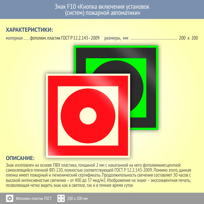 Знак F10 «Кнопка включения установок (систем) пожарной автоматики» (фотолюминесцентный пластик ГОСТ 34428-2018, 200х200 мм) в Нижнекамске купить