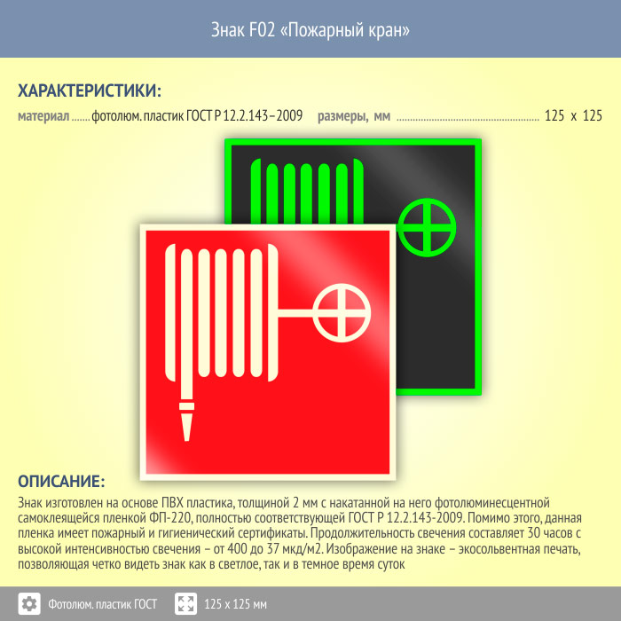 Знак F02 «Пожарный кран» (фотолюминесцентный пластик ГОСТ 34428-2018, 125х125 мм) в Нижнекамске купить
