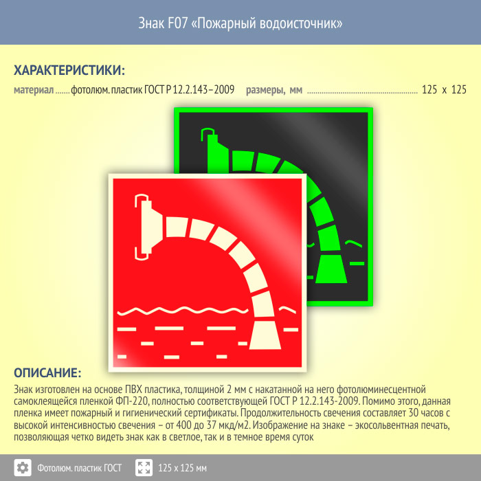 Знак F07 «Пожарный водоисточник» (фотолюминесцентный пластик ГОСТ 34428-2018, 125х125 мм) в Нижнекамске купить