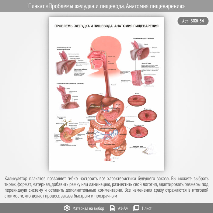 Плакат «Проблемы желудка и пищевода. Анатомия пищеварения» (ЗОЖ-34, 1 лист) в Нижнекамске купить